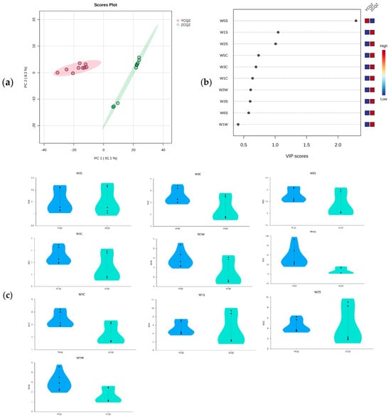 The PCA results of the E-nose response values are presented in Figure 2a, displaying the 95% confidence region. The cumulative variance contribution rates of the first principal component (91.1%) and the second principal component (8.3%) sum to 99.4%, indicating that they capture most of the information in the original data. The distance between the confidence ellipses indicates that the data points of the two types of silage can be distinguished, suggesting that the electronic nose is capable of distinguishing between normal (ZCQZ) and abnormal (YCQZ) silage by reflecting the overall flavor profile of the samples. To further assess the contribution degree of each sensor in the electronic nose, the PLS-DA discriminant results are illustrated in Figure 2b. A VIP value exceeding 1.0 is typically regarded as indicative of significant importance in the PLS-DA discriminant process. The electronic nose sensors with VIP values above 1.0 include W5S, highlighting their crucial roles in differentiating the odors of normal and abnormal silage (p < 0.05). The results of the significance analysis are shown in Table 2. The five sensors—W5S, W1C, W1W, W3C, and W2W—show significant differences in distinguishing between the two types of silage samples (p < 0.01).