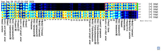 VOC fingerprint comparisons of two varieties of silage samples detected by HS-GC-IMS. Each row represents all the signal peaks selected from a silage sample. The substances within the red box in Figure 4 have higher content in ZCQZ, while the substances within the yellow box have higher content in YCQZ.