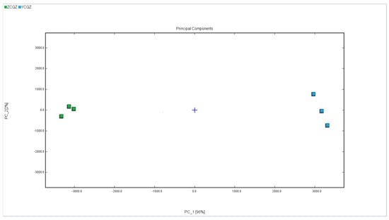 According to the PCA analysis chart of VOCs detected by GC-IMS, the cumulative variance contribution of PCA1 (98.2%) and PCA2 (1%) was 99.2%, effectively distinguishing the samples between different groups. As shown in Figure 5, the GC-IMS results align with the E-nose analysis results, and the considerable distance between the two sample groups indicates that the VOCs in the two types of silage are significantly different.