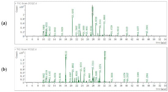 The total ion chromatograms identified by HS-SPME-GC-MS for (a) normal and (b) abnormal silage groups. Abscissa: drift times. Ordinate: reactant ion peak.