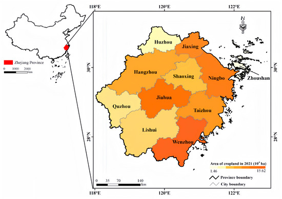 The study takes Zhejiang province as the study area, which is located on the southeast coast of China (118°01′–123°10′ E and 27°02′–31°11′ N), with a total area of 10.55 million hectares and 11 prefecture-level cities (Figure 1). According to The Third National Land Resource Survey of Zhejiang Province, Zhejiang had 1.29 million hectares of farmland in 2021, accounting for 12.23% of the total area. Within this, there are 1.06 million hectares of paddy fields, accounting for 82.36%, and 0.23 million hectares of dry land, accounting for 17.64%. Although Zhejiang province is one of the provinces with the most comprehensive and rapid development in China, there is still the problem of an excessive income gap between urban and rural areas. According to the China Statistical Yearbook and the Zhejiang Statistical Yearbook in 2022, the per capita income of urban residents in Zhejiang was CNY 68,487 and that of rural residents was CNY 35,247 in 2021, both higher than the national average. However, the income gap between urban and rural residents in Zhejiang is CNY 33,240, higher than the national average, CNY 28,481.