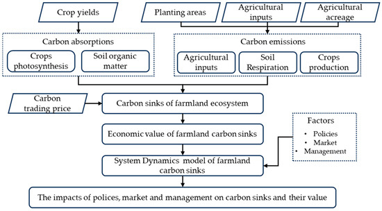 Referring to Yang et al. [28], we used the difference between the carbon absorption and emissions of farmland to quantify carbon sinks in the farmland ecosystem. The carbon absorption of farmland includes carbon absorption of crops and soil. The carbon emissions of farmland include carbon emissions of agricultural inputs, soil and crops. Then, the market value method was used to quantify the economic value of carbon sinks. Finally, we used the SD model to simulate the impacts of different factors on the economic value of carbon sinks (Figure 2).