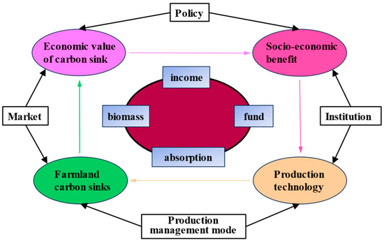 The economic value of farmland carbon sinks belongs to intangible assets, which can increase agricultural output value. When the agricultural output value increases, the government can obtain more financial allocations. With more funds, the government can invest in farmland carbon sink management projects or give certain subsidies to farmers operating management projects [39]. This will reduce the operational risks of management projects, guarantee the income of farmers and attract more farmers and social capital to operate management projects. The rise of management projects will promote the increase of soil carbon absorption, carbon sinks and their economic value.