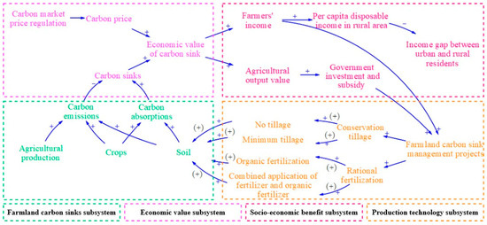 Economic value of carbon sink → (+) agricultural output value → (+) government investments and subsidy → (+) farmland carbon sink management projects → (+) rational fertilization project/conservation tillage project → (+) OF/FOF/NT/MT → (+) soil carbon absorptions → (+) carbon sinks → (+) economic value of carbon sink.