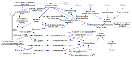 Similarly, the subsystem of social-economic benefit mainly calculates the effect of the economic value of carbon sinks on the increase in farmers’ income and agricultural output value. Each arrow represents an equation. We used a series of equations to measure the impact of farmland carbon sinks on farmers’ income and the urban–rural income gap index.