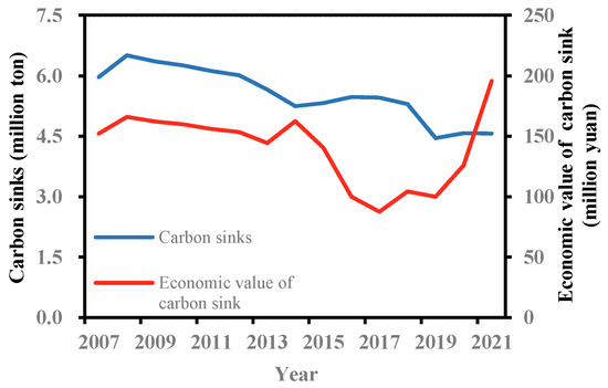 The economic value of farmland carbon sinks from 2007 to 2021 generally showed a trend of first decreasing and then increasing (Figure 6). Before 2017, the economic value of carbon sinks showed a downward trend on the whole, from CNY 159.27 million in 2007 to CNY 94.77 million in 2017, a decrease of 42.36%, with an average annual decline rate of 5.36%. There were significant fluctuations from 2013 to 2016. After 2017, the economic value of carbon sinks increased rapidly, from CNY 87.77 million to 196.82 million, with an increase rate of 123.09% and an average annual growth rate of 17.41%. The upward trend is most evident from 2019 to 2021. In 2021, it reached the peak over the past 15 years.