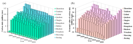 On the scale of cities, the change trend of the economic value of farmland carbon sinks in 10 cities is consistent with the overall trend, while only Zhoushan shows the opposite trend. The economic value of farmland carbon sinks in Zhoushan showed an overall rising trend before 2017, but decreased rapidly after 2017 and reached its lowest value in 2021 (Figure 7b). Compared with 2007, nine cities achieved an increase in the economic value of farmland carbon sinks in 2021, and only Zhoushan and Huzhou decreased. Wenzhou increased the most, by CNY 15.52 million. Zhoushan and Huzhou decreased by CNY 7.29 million and 0.60 million, respectively.