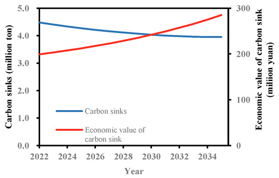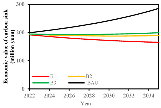 Carbon sinks in farmland will show a trend of decline under the BAU scenario, but the decline rate is decreasing (Figure 8). From 2022 to 2035, the carbon sinks in farmland will be reduced from 4.48 million tons to 3.95 million tons, a decrease of 11.79%, with an average annual decline rate of 0.07%. The decline rate of farmland carbon sinks in 2022–2030 is 9.87%, while the decline rate in 2031–2035 is reduced to 1.41%. The economic value of farmland carbon sinks will maintain a steady increase. From 2022 to 2035, the economic value of carbon sinks will increase from CNY 199.05 million to CNY 285.13 million, with an increase of 43.22% and an average annual growth rate of 2.80%.