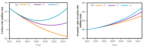 Effects of government investment on carbon sinks and their economic value. (a) Carbon sinks. (b) Economic value of carbon sinks. Note: The A1–3 scenarios represent a change in the proportion of government investment (10, 25, 40%).
