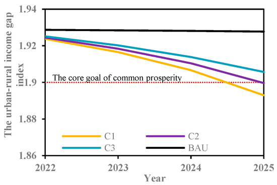 Effects of human intervention on the urban–rural income gap. Note: The C1–3 scenarios represent an artificial change in carbon prices (30, 32, 35%).