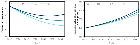 The factor inputs of production have a positive effect on the carbon sinks in farmland and their economic value. The greater the inputs of farmers’ production factors, the greater the carbon sinks in farmland and their economic value. The change curve of farmland carbon sinks showed a trend of first decreasing and then increasing. The greater the production inputs, the earlier the carbon sinks changed from decreasing to increasing (Figure 12a). Carbon sinks in farmland under the D2 scenario are expected to increase in 2034, while the D3 scenario is 2032. Compared with the D1 scenario, the production inputs in D2 are more than double, the carbon sinks will increase by 1.84% and the economic value of carbon sinks will increase by 2.04%. Compared with D1, the production inputs in D3 are twice as much, the carbon sinks in farmland increase by 3.58% and the total economic value of farmland carbon sinks increases by 3.94% (Figure 12).