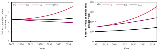 Effects of production structure on soil carbon absorption and economic value of carbon sink. (a) Soil carbon absorption of farmland. (b) Economic value of carbon sink. Note: The E1–2 scenarios represent a change in production methods.