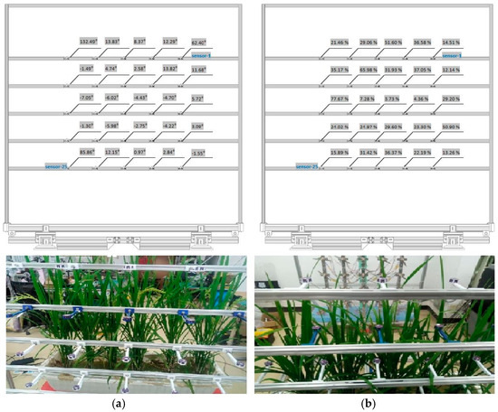 Subsequently, the rice plants were positioned 1.1 m from the rotor array, and the experimental protocol was initiated. The rotor array operated continuously for two minutes at the speed indicated in Figure 3a, followed by a two-minute pause. This cycle was repeated 15 times at different intervals throughout the day, spanning the critical growth stages of rice: heading, panicle, and flowering. During each cycle, wind field data were captured by the sensor array positioned in front of the rice plants. These measurements provided real-time insights into the rotor airflow’s influence on microclimate variables across various developmental stages, enabling a comprehensive analysis of its effects on crop growth and yield.