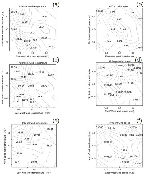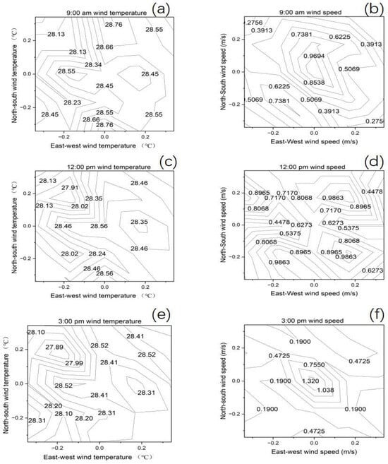 The rice growth stages (heading, panicle, and flowering) are critically influenced by microclimatic factors, such as wind speed and temperature, as illustrated by dynamic changes at three specific times (9:00 a.m., 12:00 p.m., and 3:00 p.m.). The wind temperature at 9:00 a.m. varies across the area, with values ranging from 28.49 °C to 29.12 °C (Figure 5a). The increase in temperature within specific zones of the contour indicates a localized warming effect, with a maximum increase of around 2.2% relative to the lower temperature areas. Figure 5b shows the wind speed at 9:00 a.m., with the highest speed recorded at 2.168 m/s near the center, representing an increase of about 187% compared to the lowest edge speed of 0.755 m/s. This enhanced airflow in the central region suggests that the rotor’s downwash significantly elevates wind speed, potentially enhancing ventilation and reducing the risk of humidity buildup within the rice canopy. At 12:00 p.m., Figure 5c presents wind temperature contours with slight changes, ranging from around 28.43 °C to 29.02 °C. These variations correspond to an increase of approximately 2.1% in the highest temperature areas, indicating continued microclimate modification. Figure 5d shows wind speed at 12:00 p.m., with peak values reaching 5.595 m/s, a significant increase of roughly 321% over the lowest edge speed of 0.169 m/s. This substantial rise in wind speed may facilitate improved airflow around the rice plants, reducing heat stress and supporting transpiration.