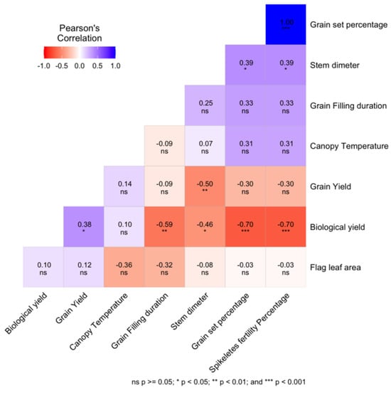 Pearson correlation matrix between rice agronomic traits under engineered microclimates. Significant correlations are marked as p < 0.05 (*), p < 0.01 (**), and p < 0.001 (***).