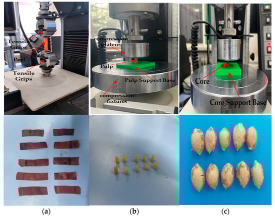 The peel, as the outermost tissue of Cerasus humilis fruit, plays a critical protective role in reducing mechanical damage [18]. To analyze the differences in the axial and radial mechanical properties of the Cerasus humilis peel, a utility knife was used to cut the peel along the axial direction into rectangular specimens measuring 40 ± 0.5 mm in length and 10 ± 0.5 mm in width. Any excess pulp adhering to the back of the peel was carefully scraped off, resulting in a thickness of 0.3 ± 0.1 mm. Before the test, to prevent the fruit peel from slipping, the peel samples were fixed in a fixture with a rubber pad and stretched at a loading rate of 5 mm/min [19]. The test was stopped upon peel rupture, and specimens that fractured near the middle region were selected as valid tensile samples. Using a sampler, the pulp was made into cylindrical specimens along the axial direction of the Cerasus humilis fruit; each sample had a height of 15 ± 0.5 mm and a diameter of 8 ± 0.5 mm. The compression test was conducted using a platen compression method. During the experiment, both types of samples were placed in the support fixture and centered on the compression plates. The distance between the grips and the sample was finely adjusted using the displacement control button. Once the platen made slight contact with the sample surface, the compression force and displacement were reset. The universal testing machine was set to a loading speed of 5 mm/min. The loading process was initiated by pressing the start button and stopped when the sample experienced compressive failure. The preparation and testing procedures for the radial samples were identical to those for the axial samples. The ellipsoidal core of Cerasus humilis fruits is embedded within the pulp, offering support and minimizing fruit deformation. During the experiment, the excess flesh surrounding the core was scraped off, and the core sample was placed in the support fixture, centered on the compression plates. Loading was applied along both the short and long axes of the core at a rate of 5 mm/min until the core fractured. The corresponding force–displacement curves and test data were recorded using a universal testing machine. Each test was repeated five times, and the average value was taken as the test result. The mechanical property testing process is shown in Figure 2. After completing the experiment, the data were processed using Origin 2024b (Origin Lab, Northampton, MA, USA). The mechanical property parameters of each tissue of Cerasus humilis fruits were calculated according to Formulas (2)–(6) [20]: