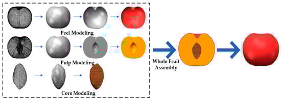 To enhance the feasibility of the study and reduce the complexity of the model, it was assumed that there is complete adhesion between the core and the pulp, without separation [22]. During modeling, the core was embedded as an independent geometric entity within the flesh structure. Geometric entity modeling is key to improving simulation accuracy. Given the irregular shape of Cerasus humilis fruit, one fruit was randomly selected from the test samples. A handheld 3D scanner (HandySCAN 700, Creaform, Lévis, QC, Canada; scanning accuracy of 0.03 mm, scanning measurement rate of 480,000 measurements/second, scanning resolution of 0.05 mm) was used to collect point cloud data of its surface and core. The open-source software CloudCompare v2.13.2 (EDF R&D, Chatou, France) was utilized to reconstruct the point cloud data, generating an initial mesh model. Subsequently, the mesh model was imported into SolidWorks (Dassault Systèmes s.a, Waltham, MA, USA) for further processing. Surface editing tools were used to refine the surface details, completing the geometric modeling of the peel, flesh, and core. Finally, in SolidWorks, the peel, pulp, and core were assembled, and constraints were applied to ensure that the positional relationships between the geometric entities were consistent with the actual structure of Cerasus humilis fruit, thus forming a complete geometric model of the fruit. The modeling process of Cerasus humilis fruit is shown in Figure 4.