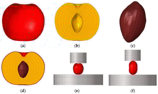 Finite element simulation modeling. (a) Peel; (b) pulp; (c) core; (d) cross-section of Cerasus humilis fruit; (e) axial compression finite element model; (f) radial compression finite element model.