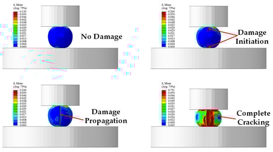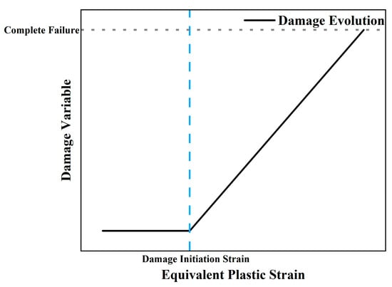 In Abaqus, the Ductile Damage model was used to simulate the damage and failure behaviors of materials due to the formation, growth, and coalescence of voids within the material during plastic deformation [26,27]. The processes of damage initiation and damage evolution are shown in Figure 6. This model is widely applied to predict phenomena such as damage accumulation and the ultimate failure of materials under tensile and compressive loads. By incorporating this model, material damage mechanisms can be introduced into finite element analyses, enabling a more accurate simulation of the material failure process.