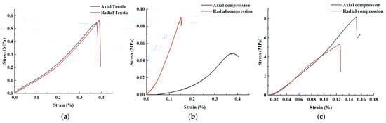 Mechanical property test results. (a) Axial and radial tensile stress–strain curves of peel; (b) axial and radial compressive stress–strain curves of pulp; (c) axial and radial compressive stress–strain curves of core.
