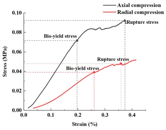 The stress–strain curves of the compressed Cerasus humilis fruits are shown in Figure 8. From Figure 8, it can be observed that the fruits exhibited a nonlinear stress–strain relationship during compression, and the axial and radial curves displayed certain similarities. The stress–strain curve exhibited a distinct biological yield point. When the stress reached the rupture point, the fruits completely fractured, followed by a decrease in stress. As the strain further increased and the indenter compressed the core, the stress rose again. The axial compressive strength of the Cerasus humilis fruits was higher than the radial compressive strength. This may be because, when subjected to axial compression, the peel and core provide greater support and resistance, causing Cerasus humilis fruits to exhibit a higher compressive strength during axial compression.