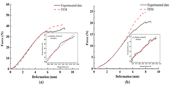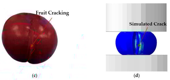 To verify the accuracy of the finite element model, the force–displacement curves and damage conditions obtained from the simulation were compared and analyzed with those from the compression tests of the Cerasus humilis fruits, as shown in Figure 9. From Figure 9a,b, it can be observed that during the elastic stage, the experimental curves and simulation curves were highly consistent, indicating that the established finite element model can accurately represent the elastic characteristics of Cerasus humilis fruit. However, in the plastic stage, some deviations appeared between the simulation and experimental curves: the force values obtained from the finite element simulation were slightly higher than the experimental results. This discrepancy may be attributed to the finite element model’s limitations in fully accounting for the fruit’s internal microstructure, such as intercellular voids and the distribution of tissue fluids, as well as the simplification of the material properties of the fruit’s tissues into an elastoplastic model. We performed a fitting analysis between the simulation data and experimental data for the yielding stage of the fruit. The fitting results showed that the correlation coefficients between the simulation and experimental data were high (axial R2 = 0.957, radial R2 = 0.976). This indicates that the established finite element model can effectively be used to analyze the mechanical properties of Cerasus humilis fruit during the compression process. In terms of damage, Figure 9c shows the compression test results of a Cerasus humilis fruit, where a significant crack was observed along the central axis of the fruit during axial compression. Figure 9d presents the finite element simulation results, which reproduced a similar crack pattern and propagation trend. The crack positions and shapes in both cases were largely consistent, further demonstrating that the established finite element model can, to some extent, predict the deformation and fracture locations of these fruits, providing a reference for studying the fracture behavior of these fruits.