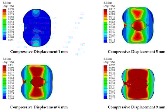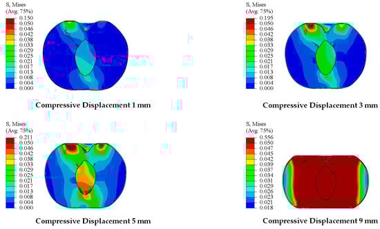 Similarly, the distribution of von Mises equivalent stress within the fruit under different compressive displacements after radially sectioning the Cerasus humilis fruit is shown in Figure 12. The internal stress in the fruit exhibited a symmetrical distribution along its radial direction. When the compressive displacement was 1 mm, the maximum stress appeared at the contact points between the peel and the indenter and base; since the maximum stress in the pulp region was lower than the radial yield strength of the pulp (0.09 MPa), no damage was observed in the fruit. As the compression displacement increased, the stress in the pulp region gradually propagated toward the core. When the compression displacement reached 5 mm, internal damage began to develop within the fruit. At 6 mm, the fruit entered the plastic deformation stage, accompanied by the appearance of fine cracks on the peel’s surface. With further increases in compression displacement, these surface cracks expanded toward the center, and the stress at the core reached its maximum. When the compression displacement reached 9 mm, the fruit underwent complete fracture.