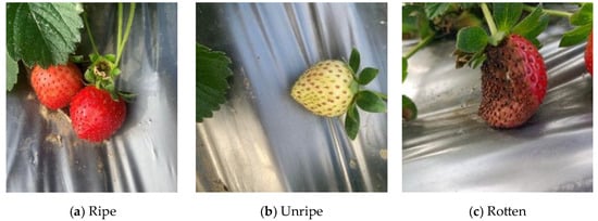 The pictures in this experiment were taken in a strawberry field on a strawberry plantation in Guangdong Province. Data sets were collected for different periods and taken under different lighting conditions and shooting angles to meet outdoor detection diversity needs. A total of 1368 strawberry images were captured and saved in JPG image format. The captured strawberry images included ripe strawberry images, unripe strawberry images, and rotten strawberry images, and the three types of strawberry images are shown in Figure 1.