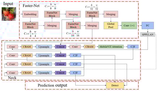 Given the shortcomings of the YOLOv5n model, this paper proposes an improved YOLOv5n model for accurately and efficiently recognizing strawberries. The overall improvement scheme is as follows: (1) The original backbone was modified to FasterNet, (2) the MobileViT and CBAM attention mechanisms were added, (3) the C2f module and SPPELAN module were introduced, and (4) the non-maximum suppression algorithm Soft-NMS was added. The improved overall structure is shown in Figure 3.