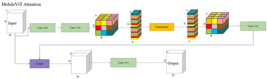To improve the shortcomings of the original attention mechanism, this paper adopted MobileViT and CBAM attention mechanism modules [,]. MobileViT is a lightweight model based on Transformers. The primary function of this module is image classification. MobileViT mainly comprises convolution, MV2 (inverted residual block in MobiletNetV2), a MobileViT block, global pooling, and fully connected layers. The network structure is shown in Figure 4.