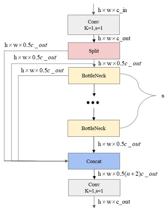 To further improve the accuracy of strawberry recognition and the light weight of the model, the C2f module was used to replace the C3 module in the original YOLOv5n. The C2f module has two convolutional layers that combine high-level features with information from above and below. The structure of the C2f module is shown in Figure 5. The C2f module consists of (1) a convolution layer (Conv), which receives the input feature map, generates the intermediate feature map, and is responsible for extracting the basic features of the input image; (2) a bottleneck module, where the intermediate feature map generated by the bottleneck module is split into two parts, one of which passes directly to the final Concat module and another to multiple bottleneck modules for further processing, and the bottleneck module processes the input feature map through a series of convolution, normalization, and activation operations, with the resulting feature map spliced with the part of the feature map passed directly in the Concat module; and (3) a Concat module, where the bottleneck module processes the feature map and directly transmits feature maps, which are spliced in the Concat block to realize feature fusion. The model can comprehensively utilize multiscale and multi-level information through the above operations and provide rich feature representations for subsequent detection and classification tasks.