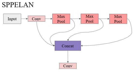 The SPPELAN module consists of (1) the maximum pooling layer, which is used to perform spatial pyramid pooling, and the maximum pooling operation is performed through kernels of different sizes to capture multiscale features, and (2) a local feature aggregation network, which improves the representation ability of the model through the aggregation of local features. The SPPELAN module improves the model’s ability to detect objects of different sizes while maintaining sensitivity to important local features in the image. The network diagram is shown in Figure 6.