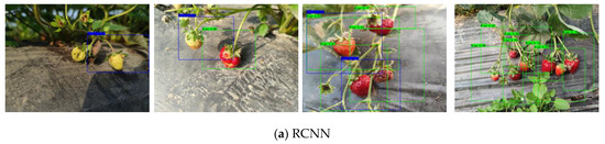 This study was conducted under different lighting conditions for detection and recognition, as shown in Figure 7. Recognition and analysis were conducted for different lighting conditions and occlusion environments. As shown in Figure 7, under the influence of light, the improved model in this paper did not experience missed or repeated detections, while the other models all experienced missed or repeated detections. Therefore, the improved model in this study can reduce the impact of outdoor light changes on strawberry recognition. Figure 7 shows the detection effect of each model. It can be seen from Figure 7 that there are a large number of mutual occlusions in the distribution of strawberries in the strawberry field, and with the change in time, the light also changes, which affects the detection effect of strawberries. By comparing different models, it can be seen that there are missed and false detections in the detection. Moreover, due to the influence of light, phenomena such as repeated detection seriously affect recognition accuracy. The RCNN detection model experienced a large number of false detections and duplicate recognitions; the YOLOv3 detection model encountered a large number of false detections, identifying rotten strawberries as mature ones; there were many missed detections in the YOLOv4 and YOLOv5n detection models; the YOLOv8 detection model encountered false detections, identifying mature strawberries as bad strawberries; and the phenomenon of merging in mature strawberries (deformed strawberries) was identified as multiple strawberries in the YOLOv9emodel, resulting in recognition errors. Strawberries in different locations and occluded strawberries could be detected by the improved YOLOv5n model with a high confidence level, indicating that the Soft-NMS module can effectively optimize the detection frame, remove detection frames with less confidence, and optimize detection frames with repeated detection. The experimental results show that the improved YOLOv5n algorithm still maintains high accuracy and robustness in complex environments and achieves accurate detection. It meets the requirements of outdoor accurate identification.
