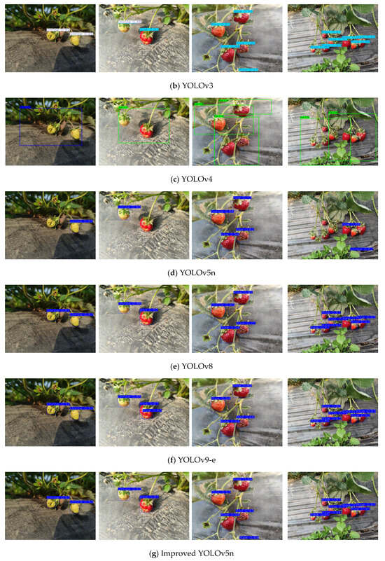 To verify the detection effectiveness of the improved YOLOv5n model, in this section, several classical models, including RCNN, YOLOv3, YOLOv4, YOLOv5n, YOLOv8, and YOLOv9-e, were trained and tested in the same environment. Table 2 lists the detection results of the compared models on the test set. The experimental results show that the overall results of the improved YOLOv5n model are better than those of other models. The mean average precision (mAP) value of the improved YOLOv5n model was 99.43%, which improved by 59.09%, 15.86%, 5.26%, 9.25%, 16.23%, and 15.58%, respectively, compared with RCNN, YOLOv3, YOLOv4, YOLOv5n, YOLOv8, and YOLOv9-e. The recall rate of the improved YOLOv5n model was 99.12%, which increased by 75.37%, 18.39%, 15.42%, 11.37%, 19.55%, and 15.94%, respectively, compared with other algorithms. The model size was 53.2 MB, 54.81 MB, 190.86 MB, and 86.83 MB, smaller than RCNN, YOLOv4, and YOLOv9-e. However, compared to the YOLOv3, YOLOv5n, and YOLOv8 models, it increased by 35.80 MB, 46.48 MB, and 46.85 MB. The detection frame rate was 16.61 frames per second, which was 56.83% and 37.39% higher than the RCNN and YOLOv9-e models. Compared to YOLOv3, YOLOv4, YOLOv5n, and YOLOv8, the detection rate decreased, and was 35.94%, 38.17%, 437.75%, and 185.56% lower than the YOLOv3, YOLOv4, YOLOv5, and YOLOv8 models, respectively. Regarding computational complexity, the improved YOLOv5n model was significantly lower than the YOLOv3, YOLOv4, YOLOv5n, and YOLOv8 models. Although the improved YOLOv5n model was not optimal regarding model size, detection speed, or computational complexity, it outperformed other models in terms of accuracy and other metrics. Therefore, the overall detection performance of this model is better. The improved YOLOv5n model can meet the practical needs of strawberry-picking detection.