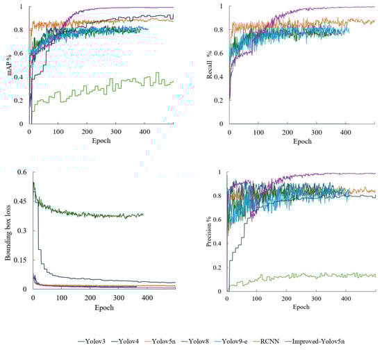 Due to the complex background, multiple interference factors, and small size of the target object, the training curve changed significantly. As shown in Figure 8, comparing the mAP, accuracy, recall, and loss function curves of different models, it can be seen that the traditional RCNN algorithm had an accuracy of less than 30% and could not be improved. The YOLO series algorithms exhibited superior performance through their unique architecture and training strategy. These algorithms achieved rapid fitting within fewer epochs and excel in accuracy, recall, loss value, and mAP. However, different algorithms exhibited varying rates of improvement and outcomes. Compared to other YOLO algorithms, the improved YOLOv5n model in this study demonstrated a slower convergence rate, yet its final results were significantly superior to those of other algorithms. Therefore, the improved YOLOv5n model proposed in this study is more suitable for detection and recognition under complex outdoor conditions.