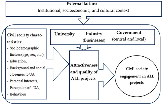 - Morawska, J.; Mrozowska, S.; Młynkowiak-Stawarz, A.; Bęben, R.; Kozłowski, A.; Carayannis, E.G. The missing helix thread in innovation ecosystems: A study of co-opetition, co-evolution, and co-specialization between university and civil society. IEEE Trans Eng Manag. 2024, 71, 14339–14349. [Google Scholar] [CrossRef]