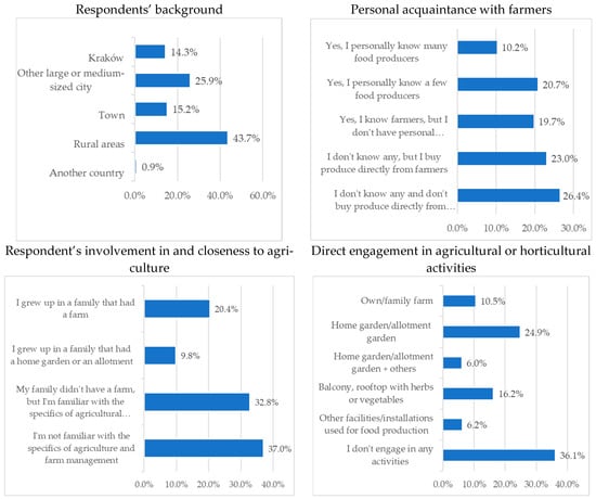 | Respondent’s involvement in and closeness to agriculture | - I’m not familiar with the specifics of agriculture and farm management - My family didn’t have a farm, but I’m familiar with the specifics of agricultural production - I grew up in a family that had a home garden or an allotment - I grew up in a family that had a farm | 214 190 57 118 | |