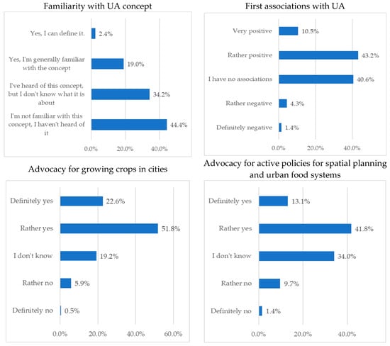| Urban agriculture perception | Familiarity with UA concept | - I’m not familiar with this concept, I haven’t heard of it - I’ve heard of this concept, but I don’t know what it is about - Yes, I’m generally familiar with the concept - Yes, I can define it. | 257 198 110 14 |