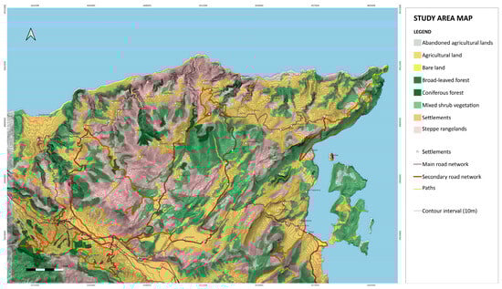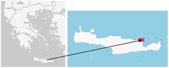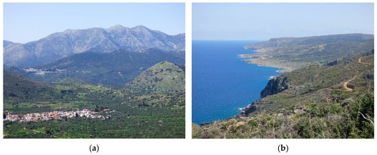 Ano Mirabello province is located at the northeastern part of Crete (Figure 1), within the Lasithi region, extending from the town of Milatos to Vrouchas and overlooking the Spinalonga harbor to the east. Ano Mirabello is under the jurisdiction of the municipality of Agios Nikolaos. The area covers a considerable portion of Mirabello Bay and is characterized by a mountainous landscape with a few villages situated along its slopes. The landscape is predominantly natural, though shaped by human intervention over the centuries. It is marked by a diversity of terrain that alternates between steep rocky cliffs, small valleys, terraced hillsides, and coastal areas (Figure 2) [].