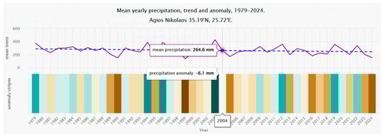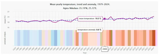 The climate is Mediterranean, with hot, dry summers and mild, rainy winters. Average annual rainfall is around 340 mm, which sustains the vegetation but also contributes to water scarcity in the region during the summer months, being one of the driest locations in Crete. Strong north winds are common, especially during the winter []. The following graph (Figure 3) presents an estimate of the average annual temperature for the broader Agios Nikolaos region. The dashed blue line represents the linear trend related to climate change. An upward-sloping line from left to right indicates a warming trend, suggesting that Agios Nikolaos is experiencing rising temperatures due to climate change. A flat line suggests no significant change, while a downward slope points to a cooling trend over time. The lower section of the graph displays the “warming stripes”, where each colored stripe corresponds to the average temperature of a specific year—blue indicates cooler years, and red indicates warmer ones.