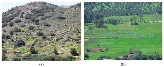 (a) Abandoned agricultural terraces. (b) Field patterns of annual crops in a mixture with olive groves. Source: author’s archive.