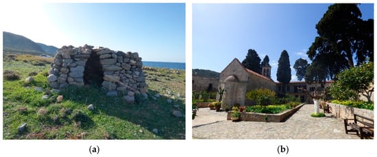The open dry cisterns collect the scarce rainwater and supply the residents who remain in the area with water for both domestic use and the watering of animals and gardens [,]. Valuable landmarks are the windmills of the area, built from stone, typically horseshoe-shaped, and organized in clusters or standing alone. Most of them are in a state of ruin, although some have been restored. The quite specific structures such as Apanemidia (Figure 8a), are dry-stone vaulted or semi-vaulted shelters or windbreaks, to accommodate one or two individuals seeking protection from the strong winds in the northern part of Ano Mirabello. The area used to have a network of lookout posts mainly along the coastline, called Vigles, which today are in a ruined state. The region also boasts several significant monasteries and churches, such as the 16th-century Monastery of Aretiou [] (Figure 8b).