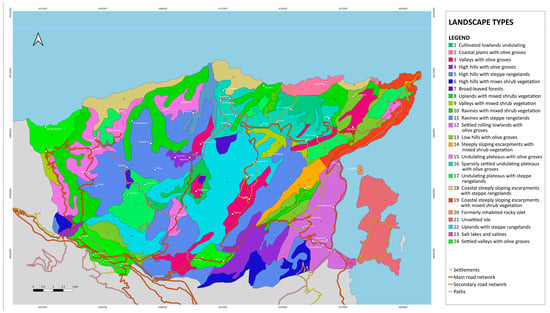The analysis above identified 97 landscape units and 24 landscape types for the Ano Mirabello region. The naming of each landscape type was based primarily on the geomorphology and land cover, with a lesser influence from the presence of settlements (Figure 10).