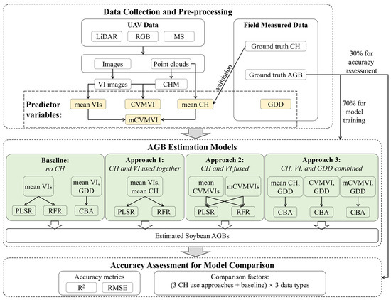 Therefore, this study aims to explore more effective ways of CH data integration to accurately estimate the AGB of soybeans. Specifically, we considered the abovementioned three approaches of CH utilization, namely, (1) traditional machine learning methods using a simple combination of VIs and CH, (2) machine learning with CH–VI-fused CVMVIs as predictor variables, and (3) hierarchical regression integrating CH, VI, and GS information, and then compared them to (4) baseline methods without CH input. To ensure the reliability of the results, we conducted the comparisons using three different types of UAV remote sensing data, i.e., light detection and ranging (LiDAR), RGB, and multispectral (MS).