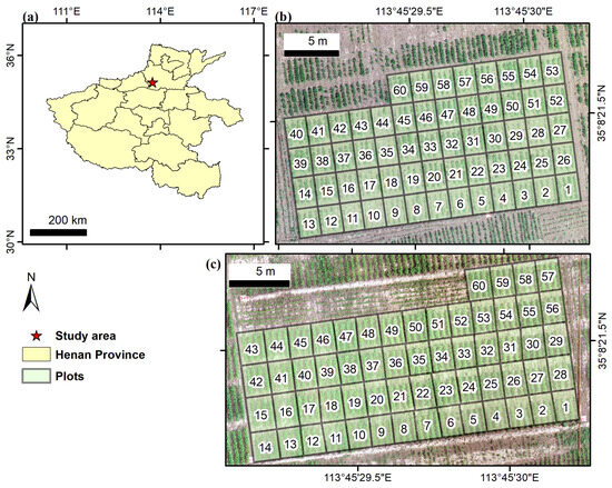 Figure 2. Experimental design: (a) location of the study area, (b) plots for the 2022 experiment, and (c) plots in 2023. The numbers in (b,c) are the plot identification numbers.
