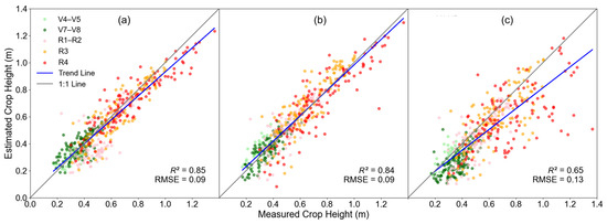 The ground-truth measurements of CH and AGB are detailed in Table A1, listing the mean, median, minimum, and maximum values for each sampling event. Following the accumulation of organic matter during crop growth, a clear increasing trend was observed in each year. In 2022, the CH increased from 0.30 m to 0.61 m, while average AGB reached 404.14 g/m2 in the R4 period. Both CH and AGB were low, mainly due to the heavy storm and hail in late July. The range was much larger in 2023, with average CH and AGB reaching 0.90 m and 633.90 g/m2, respectively.