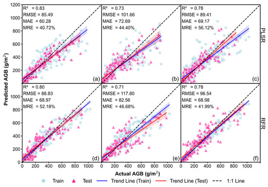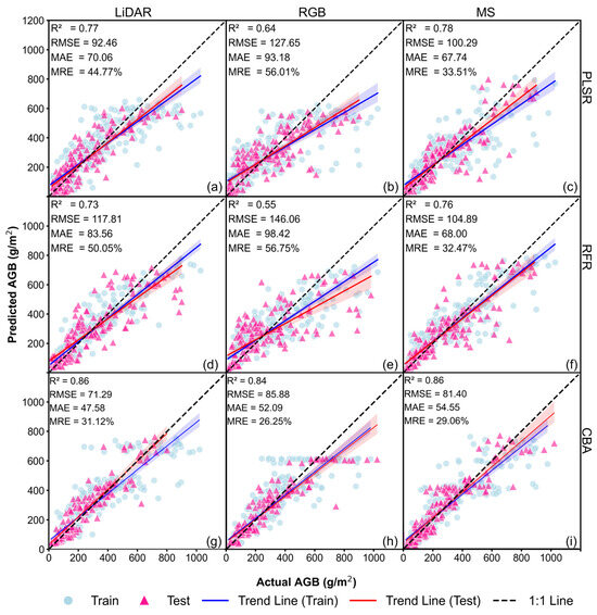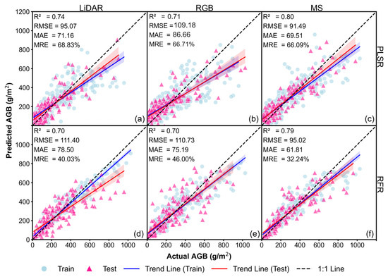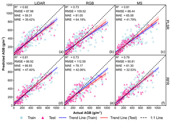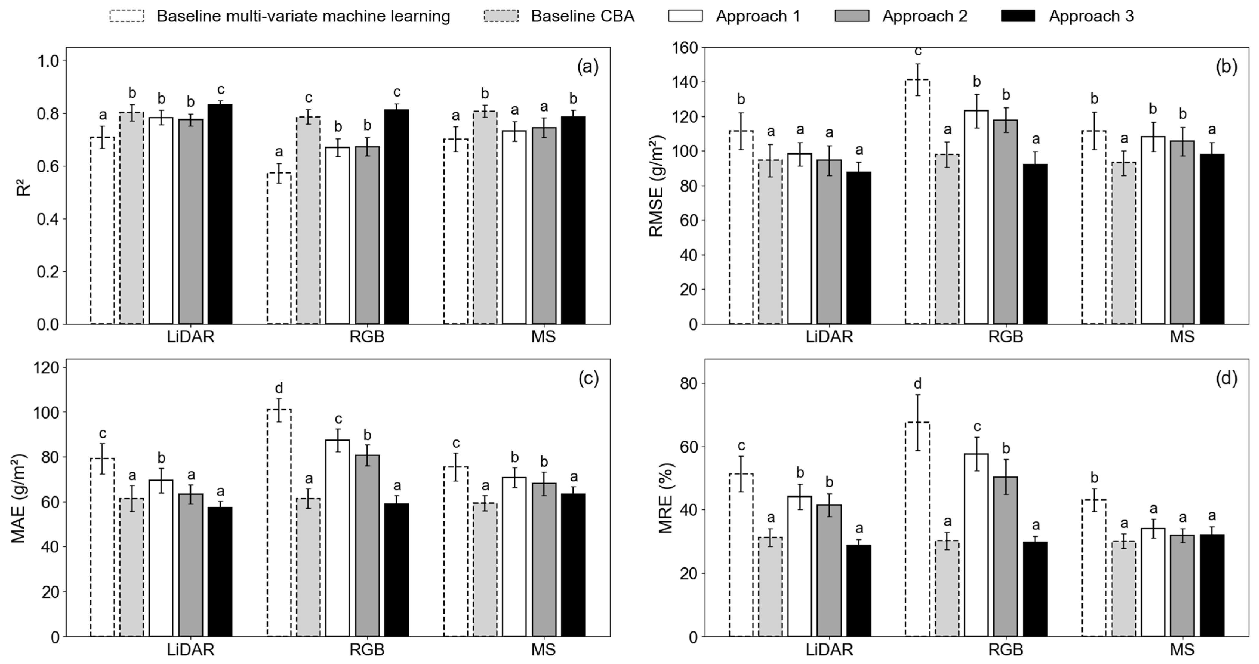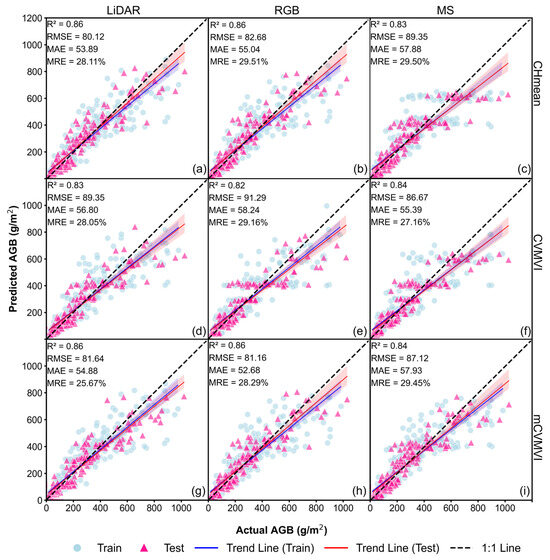 The CVMVIs were calculated for each VI, resulting in 16 CVMVIs for the LiDAR and RGB data and 20 CVMVIs for the MS data. The CVMVIs from each data source were then used as predictor variables in both the PLSR and RFR models to predict AGB.