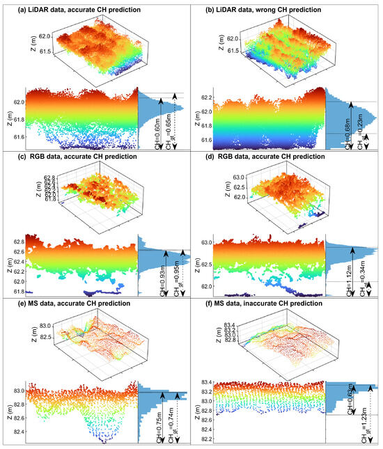 Different combinations of Z1 (99–80%, with 1% steps) and Z0 (5–0%, with 1% steps) were considered. For each data source (i.e., LiDAR, RGB, and MS), CHs calculated from these 120 combinations were compared to the field-measured CHs. The combination with the highest accuracy was selected as the optimal metric and used for the subsequent CH calculations.