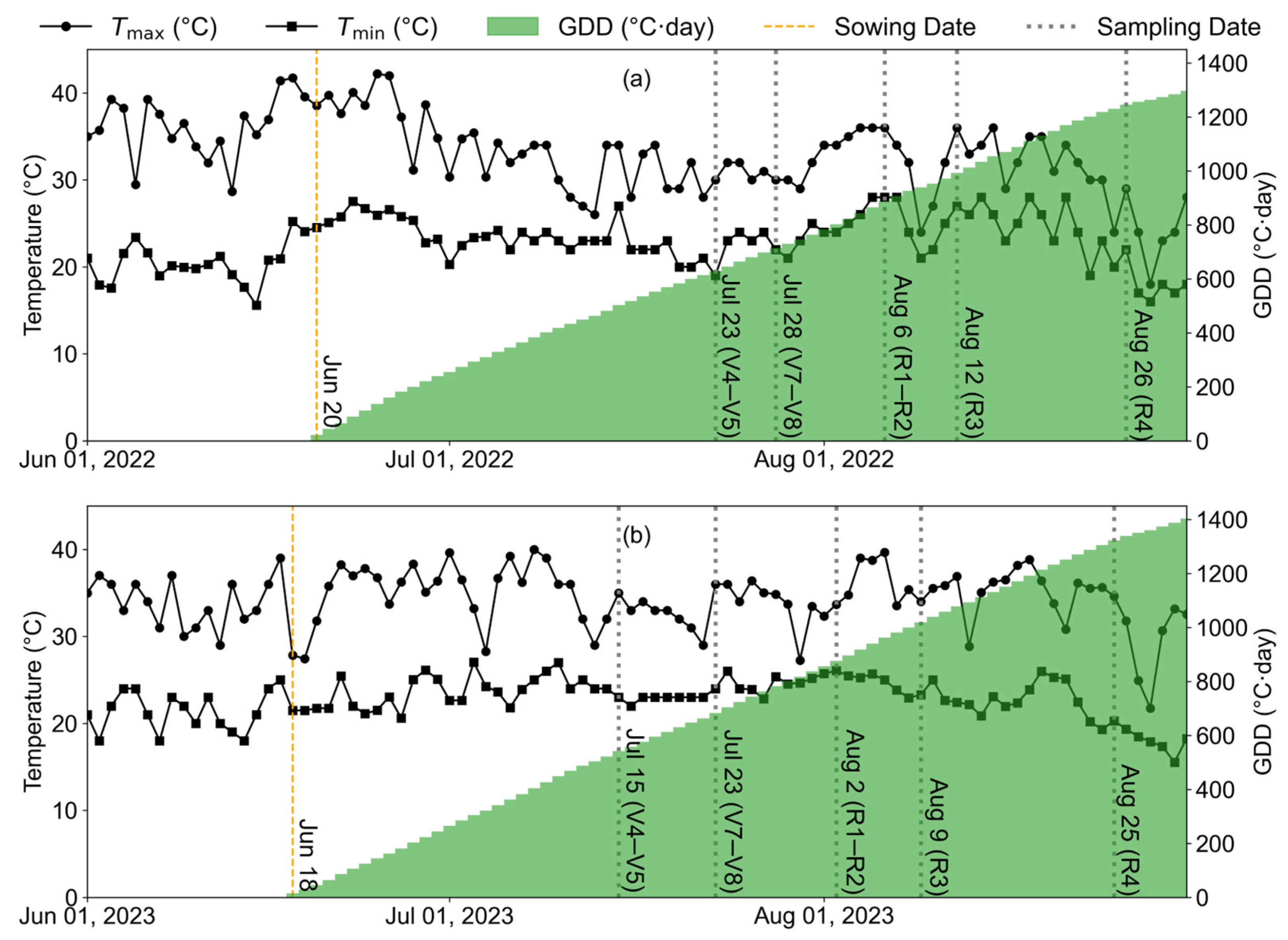 where DAS denotes the days after sowing, Tmax and Tmin refer to the maximum and minimum temperatures for each DAS, and Tbase is the base temperature of the crop. In this study, the base temperature was set to 10 °C [42]. Figure A2 illustrates the daily maximum/minimum temperatures and the cumulative GDD trends during the soybean growing seasons of 2022 and 2023, with sowing and sampling dates also indicated.