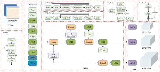 YOLOv11 is an advanced object detection algorithm that was released by Ultralytics in September 2024 [16]. Compared to its predecessors, it achieves substantial improvements in both accuracy and inference speed. Its detailed network architecture, depicted in Figure 1, primarily consists of a backbone, neck, and detection head. The YOLOv11’s architecture includes an optimized CSPDarknet53 backbone network, which hierarchically extracts multi-scale representations through a sequence of five downsampling stages (denoted as P1–P5). This design facilitates progressive feature abstraction while preserving fine-grained spatial information across different resolution levels. The original C2f modules are also replaced by refined C3K2 modules to reinforce feature learning. The backbone utilizes CBS modules that integrate convolutional processing, batch normalization, and the SiLU activation function to enhance feature representation. A Spatial Pyramid Pooling Fast (SPPF) module then pools the feature maps at fixed scales, boosting feature diversity, and a C2PSA module with Pyramid Slice Attention further augments the model’s extraction capacity. The neck employs a PAN-FPN design with an added bottom-up pathway to merge shallow positional cues and deep semantic features, effectively overcoming the localization gaps in conventional FPN structures. The detection head features a decoupled design, with separate branches dedicated to object classification and bounding box regression. It achieves classification by using Binary Cross-Entropy (BCE), while its regression leverages Distribution Focal Loss (DFL) paired with Complete IoU (CIoU). Two depthwise convolution (DWConv) layers further reduce the computational overhead and parameter count, boosting efficiency without sacrificing accuracy.